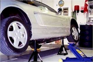 3. Double-check the parking brake (make sure it's set) and smoothly start jacking up the car. Make sure the jack stands are set to the same height and are secure. Position the stands so the jack points will make contact in the center of the stands. Slowly lower the jack, keeping an eye on the stands and contact points, you may have to re-position the stands slightly to keep the points centered.